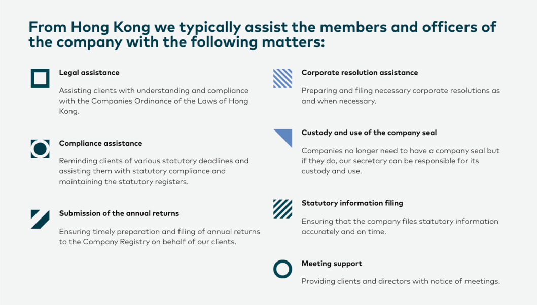 《香港公司條例》(第 622 章)規定,在香港成立的每間公司,不論是由股份有限公司或擔保有限公司,均須委任一名公司秘書。此委任必須在公司成立後 15 天內作出,而非香港公司則須在六個月內委任。公司秘書必須是香港居民,或是在香港擁有註冊辦事處的法人機構。如不遵從此項規定,可能會被處以巨額罰款,甚至監禁。因此,委任公司秘書不單是良好的商業守則,亦是法律責任。